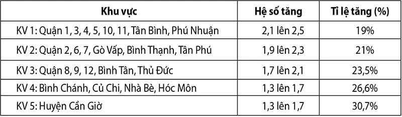 Theo tờ trình của UBND TP.HCM, hệ số K năm 2019 tăng lên 0,4 lần sẽ tương ứng với mức tăng theo từng khu vực như sau: