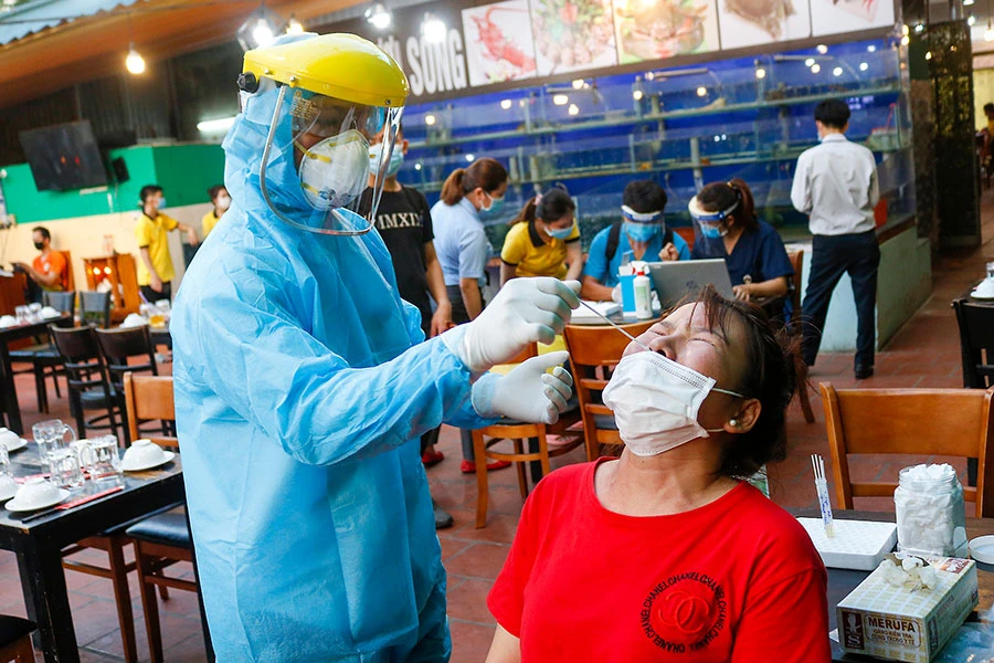 Nhân viên y tế lấy mẫu xét nghiệm cho người dân tại một quán nhậu