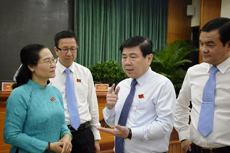 Chủ tịch UBND TP.HCM Nguyễn Thành Phong trao đổi với Chủ tịch HĐND TP Nguyễn Thị Lệ tại kỳ họp. Ảnh: TÁ LÂM