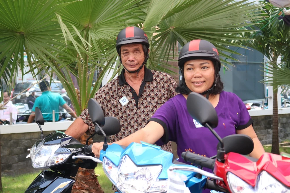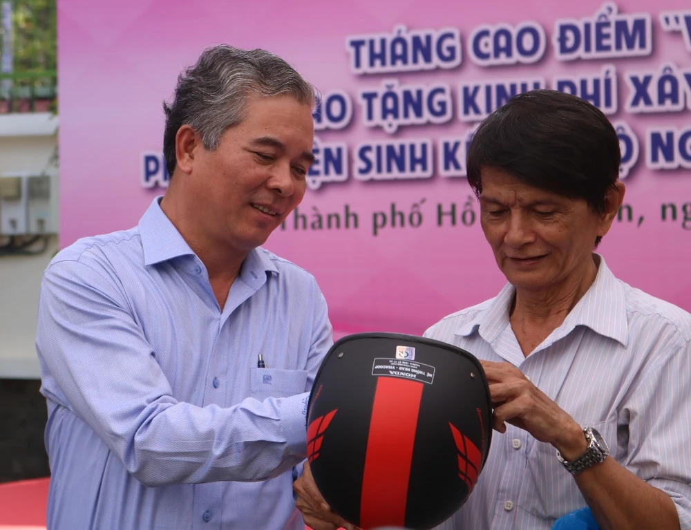 Ông Ngô Minh Châu, Phó Chủ tịch UBND TP.HCM, cũng có mặt tại buổi lễ phát động. Ông cùng chia vui với người dân khi được hỗ trợ xe máy và nón bảo hiểm. Ảnh: THANH TUYỀN