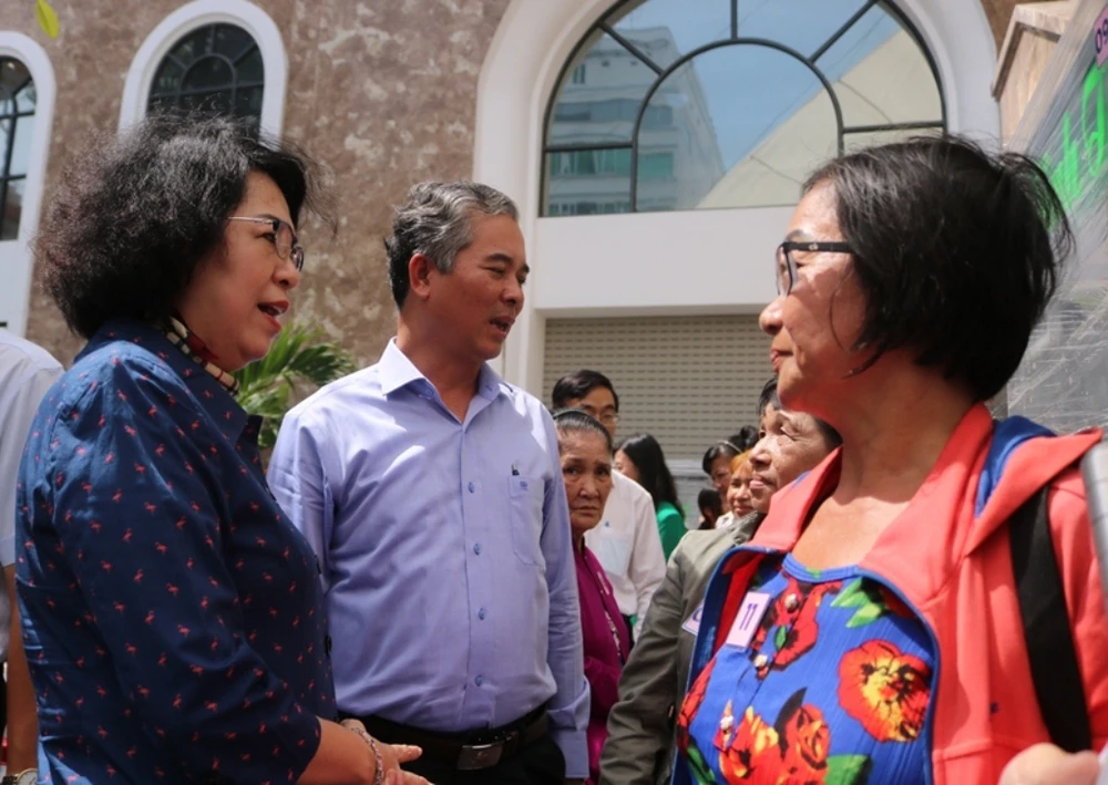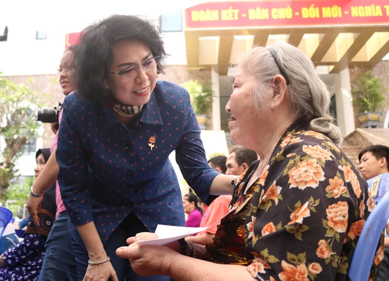 Bà Tô Thị Bích Châu, Chủ tịch UBMTTQ Việt Nam TP.HCM, thăm hỏi, động viên người dân có hoàn cảnh khó khăn và trao phương tiện sinh kế cho họ. Ảnh: THANH TUYỀN