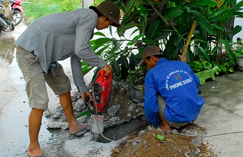 Thi công đường ống cấp nước sạch cho một khu dân cư ở xã Bình Hưng, huyện Bình Chánh. Ảnh: HTD