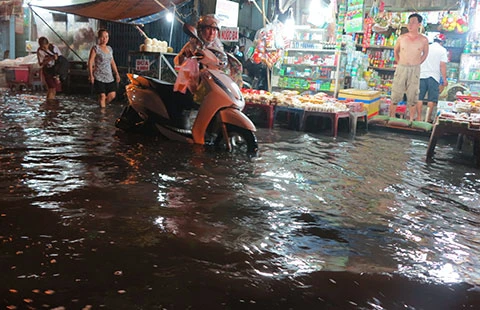 Triều cường gây ngập trên đường An Dương Vương, quận Bình Tân. Ảnh: MINH QUÝ