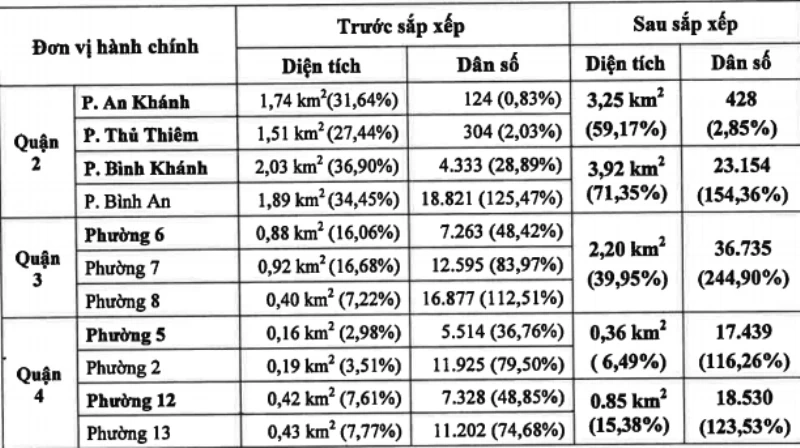 Như vậy, với phương án sắp xếp như trên sẽ giảm được 10 đơn vị (từ 322 phường, xã xuống còn 312), trong đó quận 2 giảm hai phường, quận 3 giảm hai phường, quận 4 giảm hai phường, quận 5 và 10 cùng giảm một phường và quận Phú Nhuận giảm hai phường.