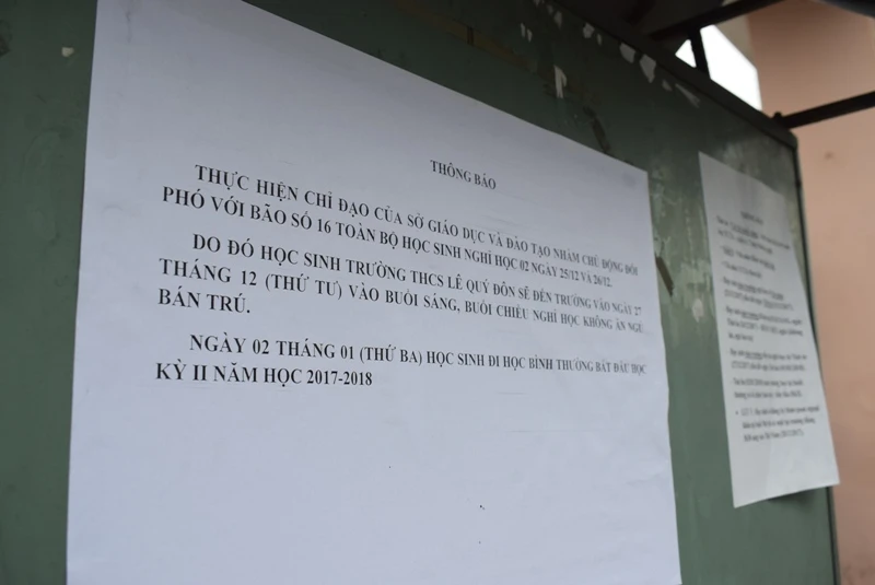 Thông tin học sinh được nghỉ học để tránh bão vừa được nhà trường, giáo viên thông báo qua điện thoại, đồng thời được dán ngay ngoài cổng trường để phụ huynh học sinh tiện theo dõi.