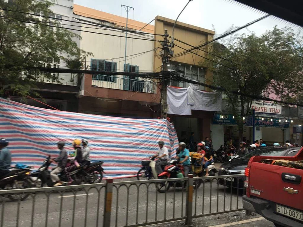 Khu vực được phong tỏa khiến giao thông trên đường Trường Chinh ùn ứ theo cả hai hướng.
