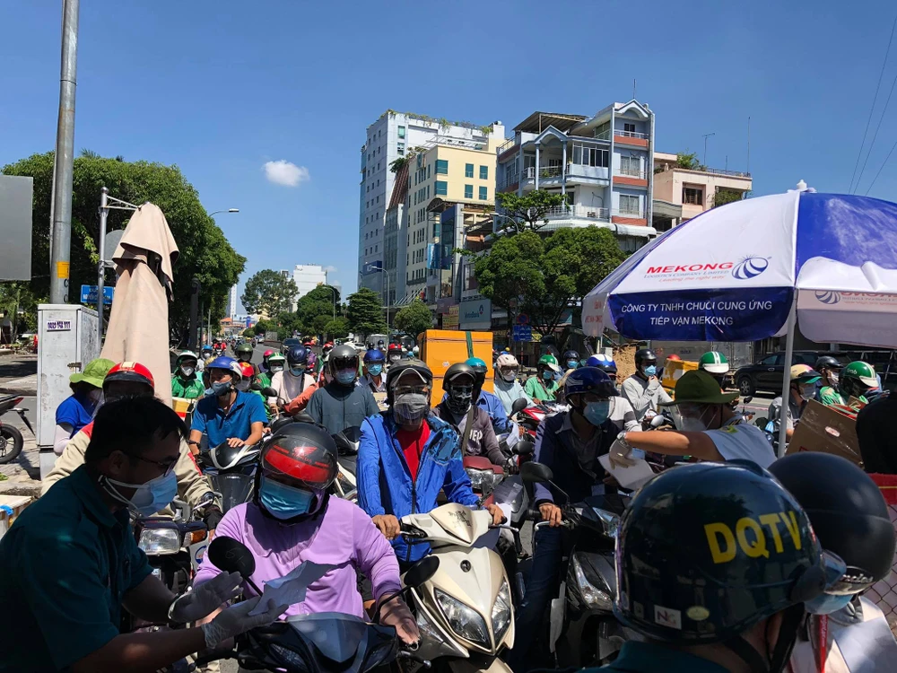 Ghi nhận của PLO sáng 16-8 tại chốt kiểm soát tại gốc đường Phan Đăng Lưu - Nguyễn Công Hoan (quận Bình Thạnh), rất đông người dân tụ lại để chờ lực lượng chức năng kiểm tra.