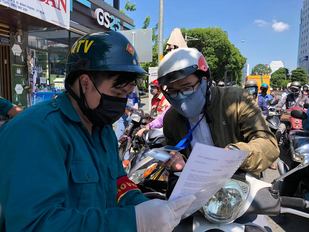 Vào khoảng 10 giờ, tại đường Đinh Bộ Lĩnh, đoạn trước bến xe Miền Đông lực lượng tại chốt cũng kiểm tra giấy ra đường của người dân.