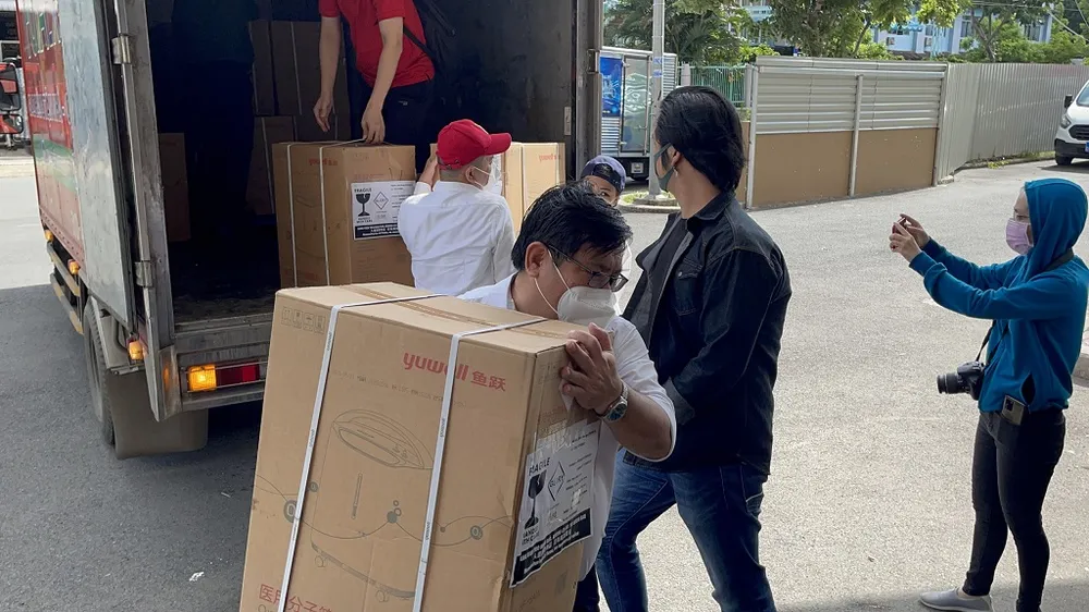 Chuyển máy cung cấp oxy đến BV Bệnh viện dã chiến thu dung diều trị bệnh COVID-19 số 1. Ảnh: MTTQ