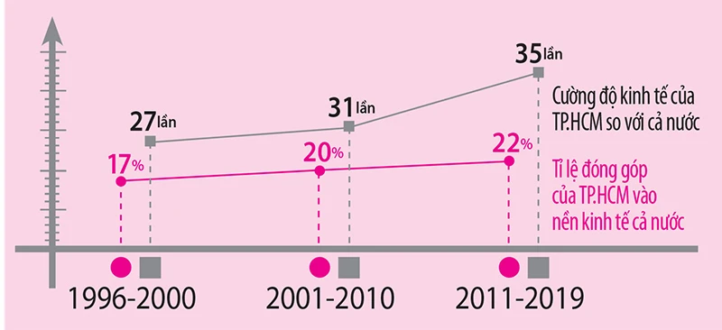 Mặc dù vậy, ông Nhân cũng nhìn nhận tốc độ tăng trưởng kinh tế của TP bị giảm, từ 1,6 lần cả nước (2001-2010) giảm còn gấp 1,2 lần (giai đoạn 2011-2019). “Có nguyên nhân chủ quan và khách quan nhưng có một nguyên nhân quan trọng là trong 20 năm qua tỉ lệ ngân sách để lại cho TP đầu tư phát triển ngày càng giảm, trong khi đóng góp vào ngân sách cả nước ngày càng tăng” - ông Nhân nói và cho rằng TP là địa phương giảm mạnh nhất.