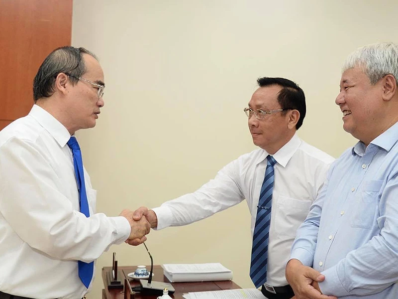 Bí thư Thành ủy TP.HCM Nguyễn Thiện Nhân trao đổi với các đại biểu dự hội nghị. Ảnh: HOÀNG GIANG