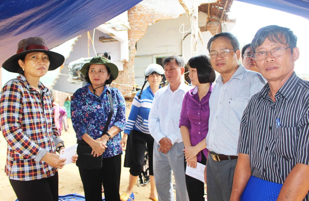 Bà Thân Thị Thư, Trưởng Ban Tuyên giáo Thành ủy TP.HCM (thứ hai từ trái sang) thăm hỏi người dân huyện Đông Hòa (Phú Yên) bị thiệt hại do bão