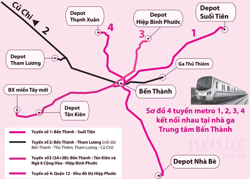 Sơ đồ bốn tuyến metro số 1, số 2, số 3, số 4 kết nối nhau tại
