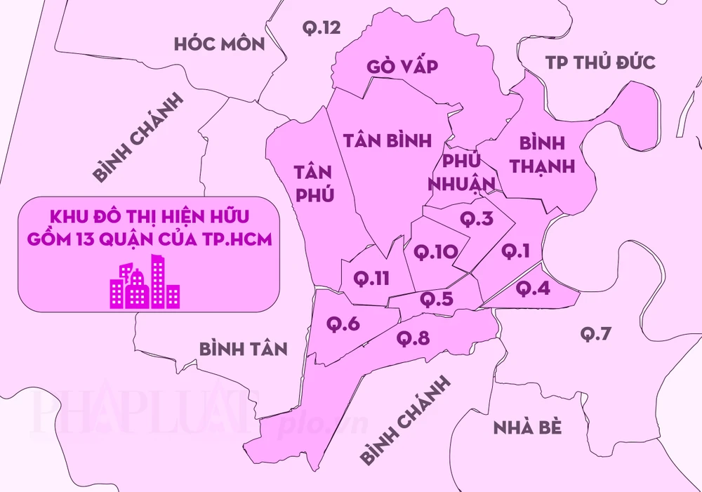 Khu đô thị cũ hiện hữu bao gồm 13 quận nội thành hiện hữu theo Quy chế quản lý quy hoạch, kiến trúc đô thị chung TP.HCM (ban hành ngày 29-8-2014). Đồ họa: HỒ TRANG