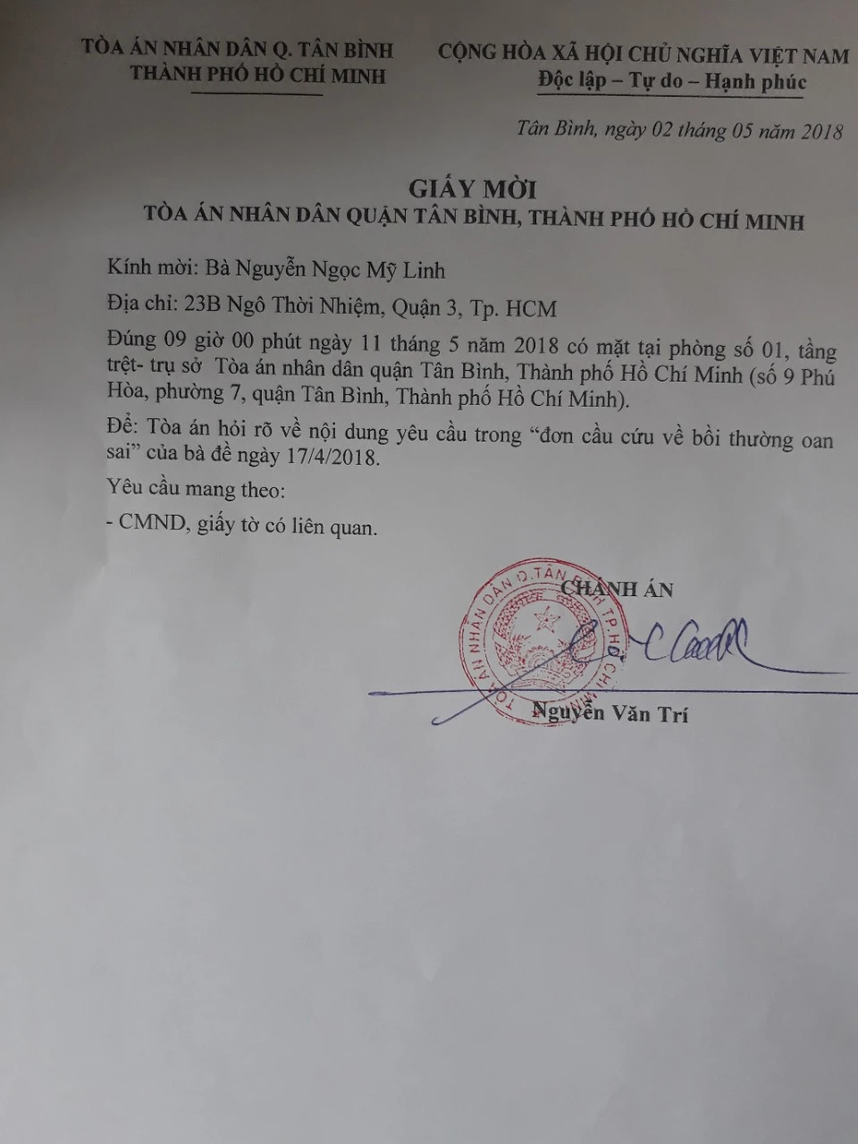 Theo giấy mời, tòa mời Mỹ Linh đúng 9 giờ ngày 11-5-2018 đến tòa để tòa hỏi rõ về nội dung yêu cầu trong đơn cầu cứu về bồi thường oan của Mỹ Linh.