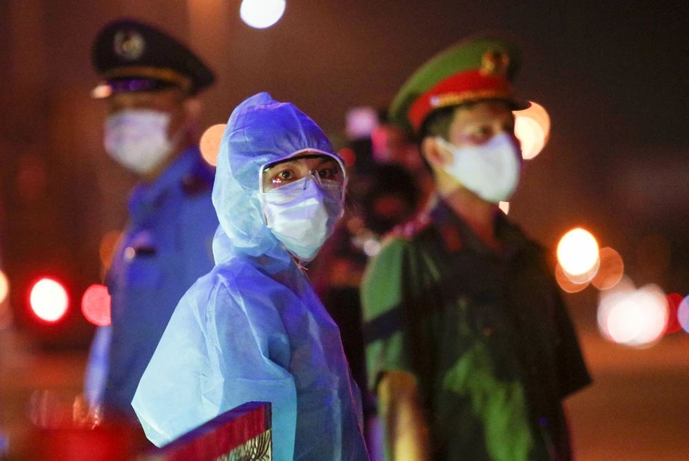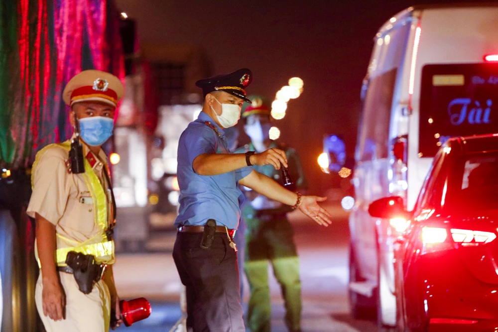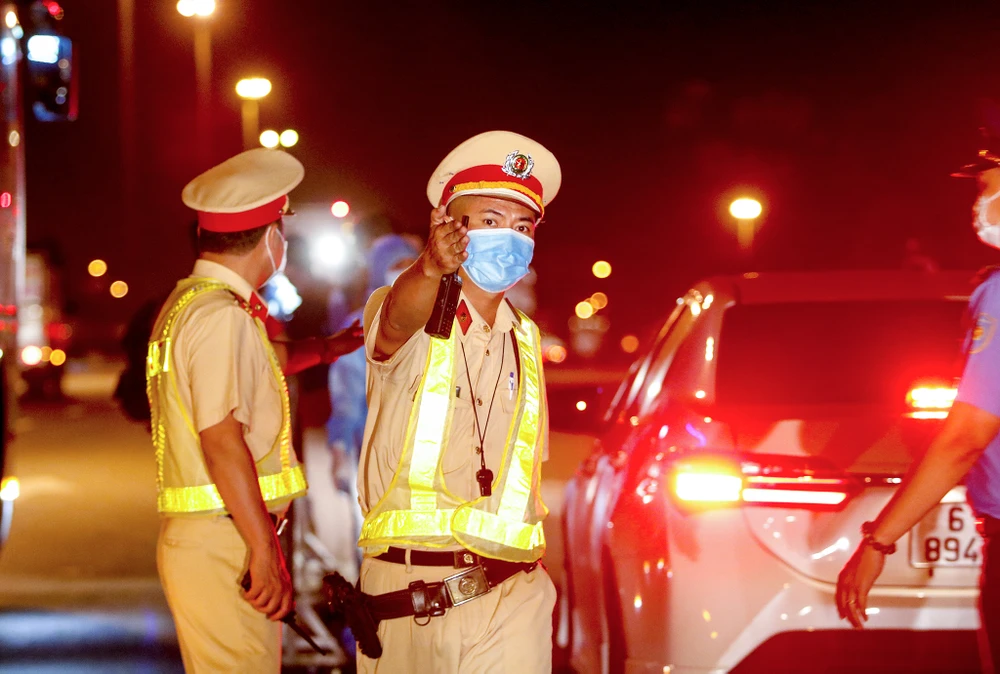 (PLO)- Các chiến sĩ CSGT trắng đêm thực hiện công tác hiệu lệnh dừng xe, hướng dẫn người dân vào khu vực kiểm tra, khai báo y tế,...
