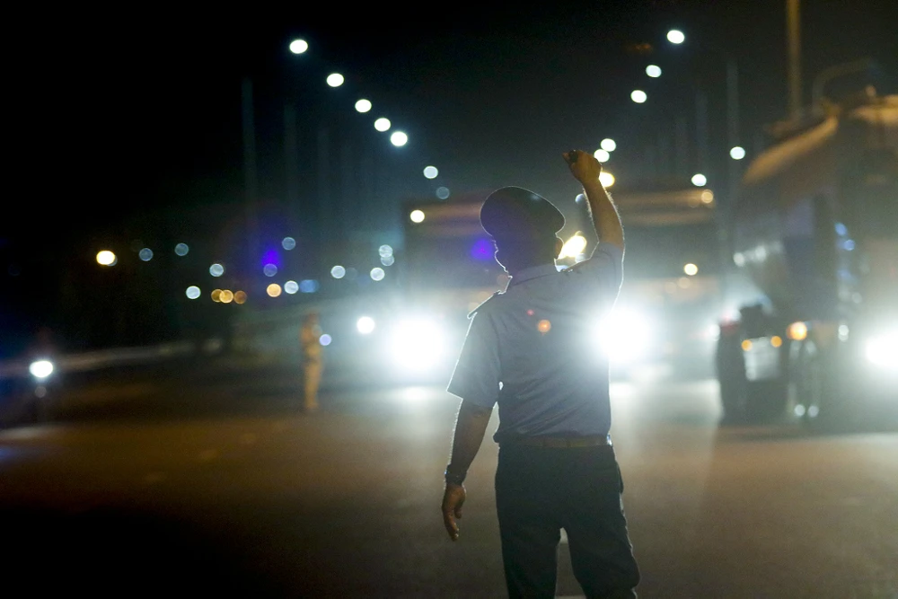 Đại uý Tô Phát Đạt, Đội Giao thông Rạch Chiếc dùng tín hiệu đèn để ra hiệu cho các phương tiện di chuyển chậm hơn khi vào gần điểm chốt.