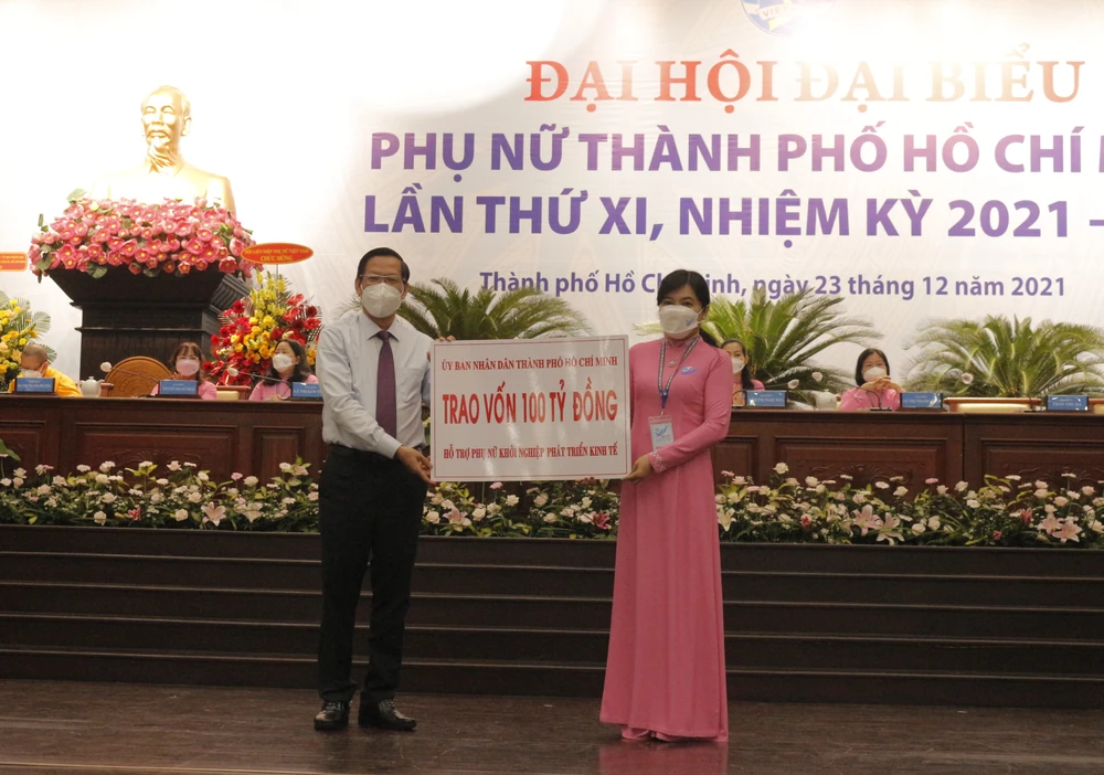 Tại đại hội, ông Phan Văn Mãi - Chủ tịch UBND Thành phố đã trao 100 tỷ đồng cho hội Liên hiệp Phụ nữ Thành phố để thực hiện đề án "Hỗ trợ vốn cho phụ nữ khởi nghiệp, sản xuất, kinh doanh, phát triển kinh tế giai đoạn 2021-2026".