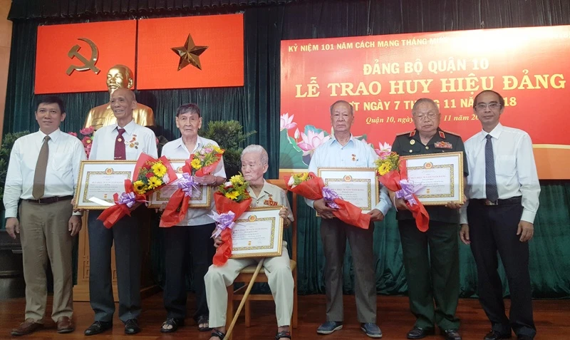 Lãnh đạo quận 10 trao huy hiệu Đảng cho các đảng viên cao tuổi Đảng. Ảnh: TÁ LÂM
