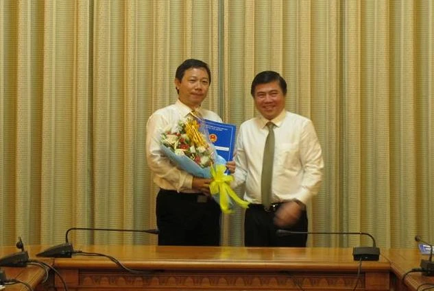 Chủ tịch UBND TP.HCM Nguyễn Thành Phong (phải) trao quyết định tiếp nhận và bổ nhiệm ông Dương Anh Đức giữ chức giám đốc Sở TT&TT TP.HCM.