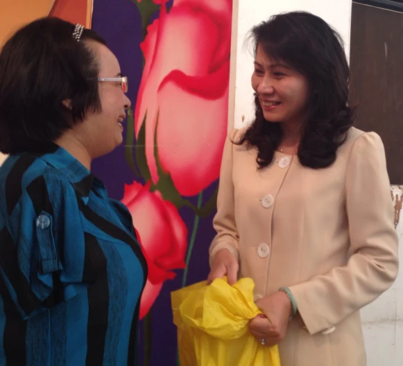 Bà Nguyễn Thu, Chủ tịch LĐLĐ TP.HCM trao quà cho các nữ công nhân bị tai nạn. Ảnh: P.ĐIỀN