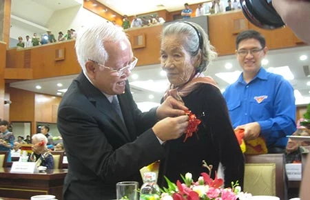 Chủ tịch UBND TP.HCM Lê Hoàng Quân trao tặng danh hiệu Mẹ Việt Nam anh hùng cho mẹ Võ Thị Ba. Ảnh: LT