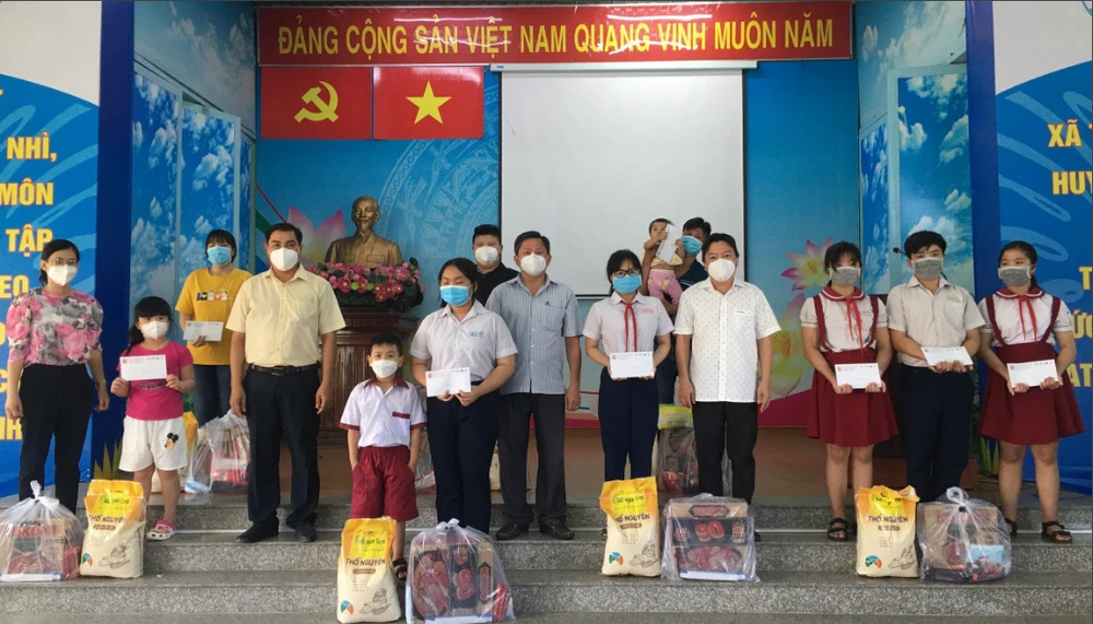 Lãnh đạo xã Tân Thới Nhì, huyện Hóc Môn, TP.HCM tặng quà cho các cháu mồ côi do COVID-19. Ảnh: TRẦN NGỌC