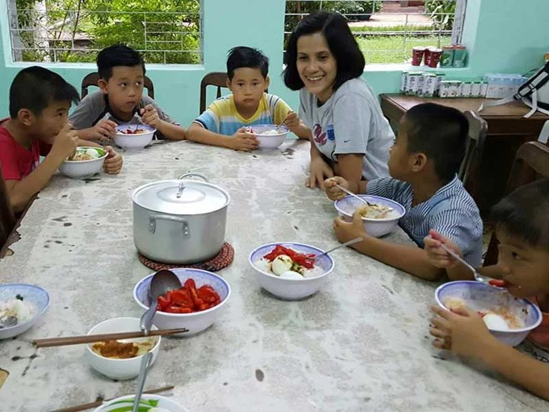 Các em nhỏ đến từ nhà Hạnh Phúc đang ăn cơm cùng các bạn và mẹ nuôi trong làng. Ảnh: HM