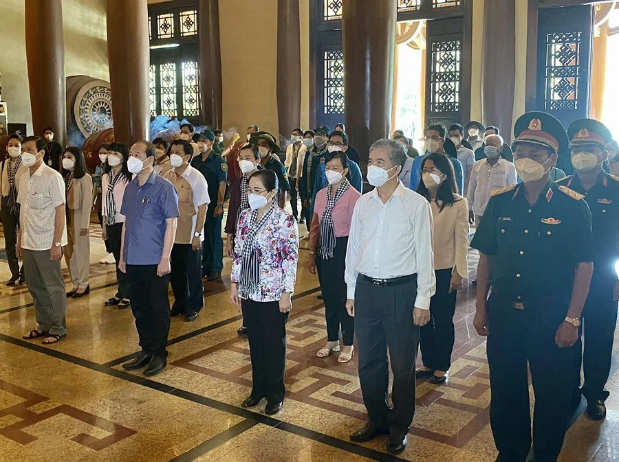 Lãnh đạo thành phố cùng tuyến đầu chống dịch làm lễ dâng hương tại Khu truyền thống cách mạng Sài Gòn-Chợ Lớn-Gia Định huyện Củ Chi. ẢNH: Sở Du lịch