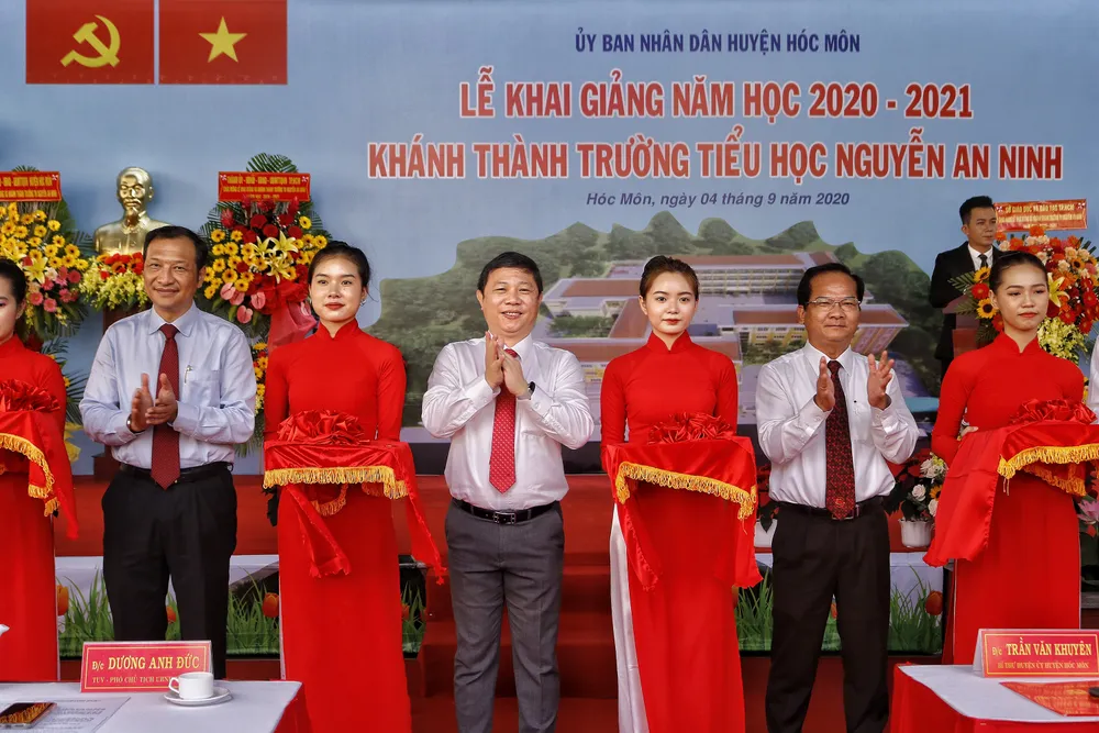 Ông Dương Anh Đức - Phó Chủ tịch UBND TP.HCM cùng các đại biểu cắt băng Khánh thành công trình Trường Tiểu học Nguyễn An Ninh.