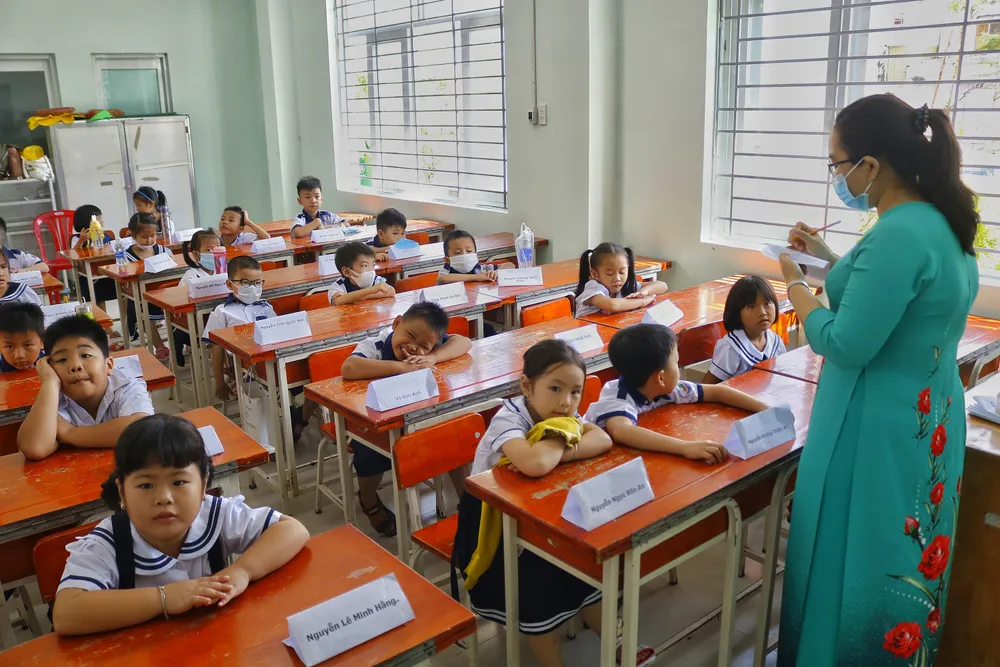 Học sinh lớp 1N được giáo viên chủ nhiệm hướng dẫn vào chỗ ngồi. Năm nay nhà trường có 11 lớp khối 1 với tổng 483 học sinh.