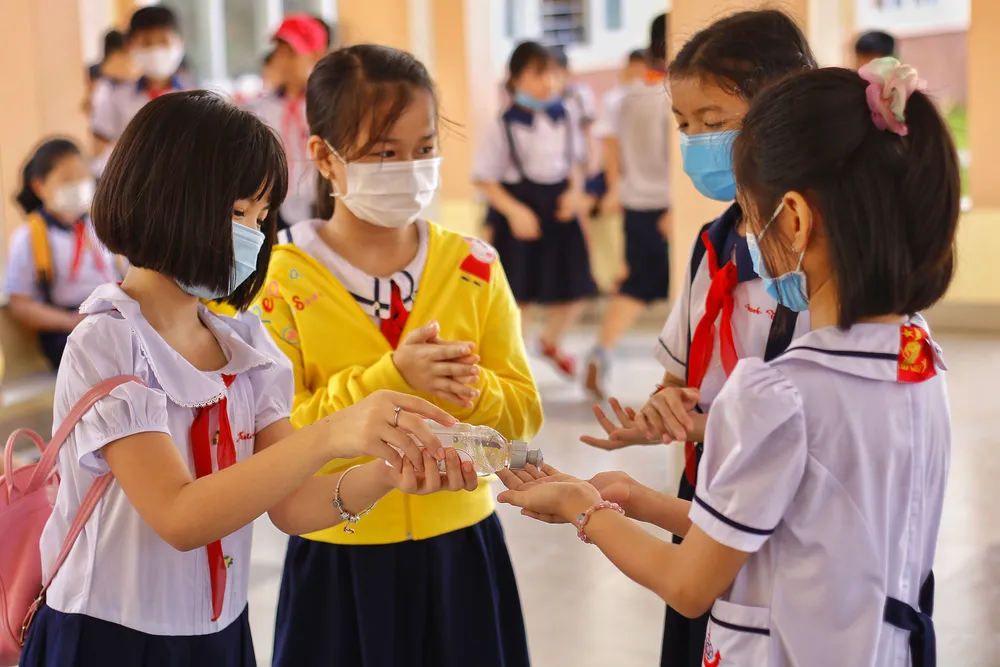 Hơn 7g30, nhà trường đón học sinh các khối lớp và thực hiện đo thân nhiệt, rửa tay sát khuẩn, nhiều học sinh tự trang bị nước rửa tay khi đến trường.