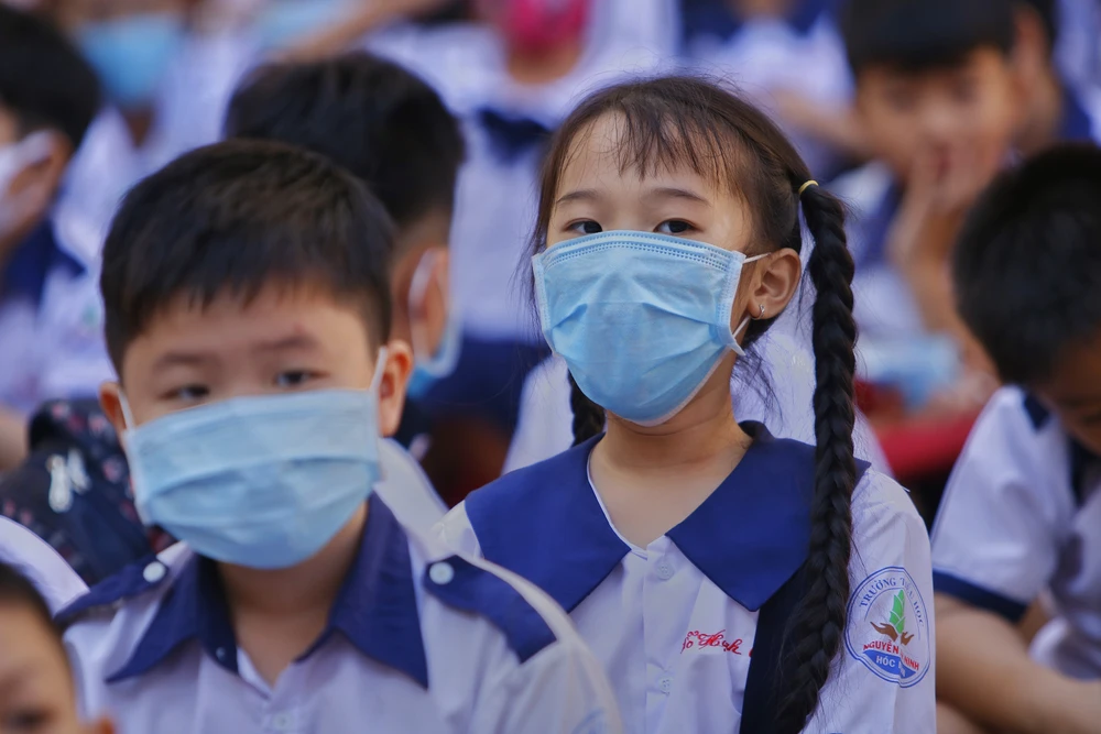 Học sinh khi ngồi dự lễ đều được giáo viên chủ nhiệm hướng dẫn mang khẩu trang để đảm bảo an toàn.