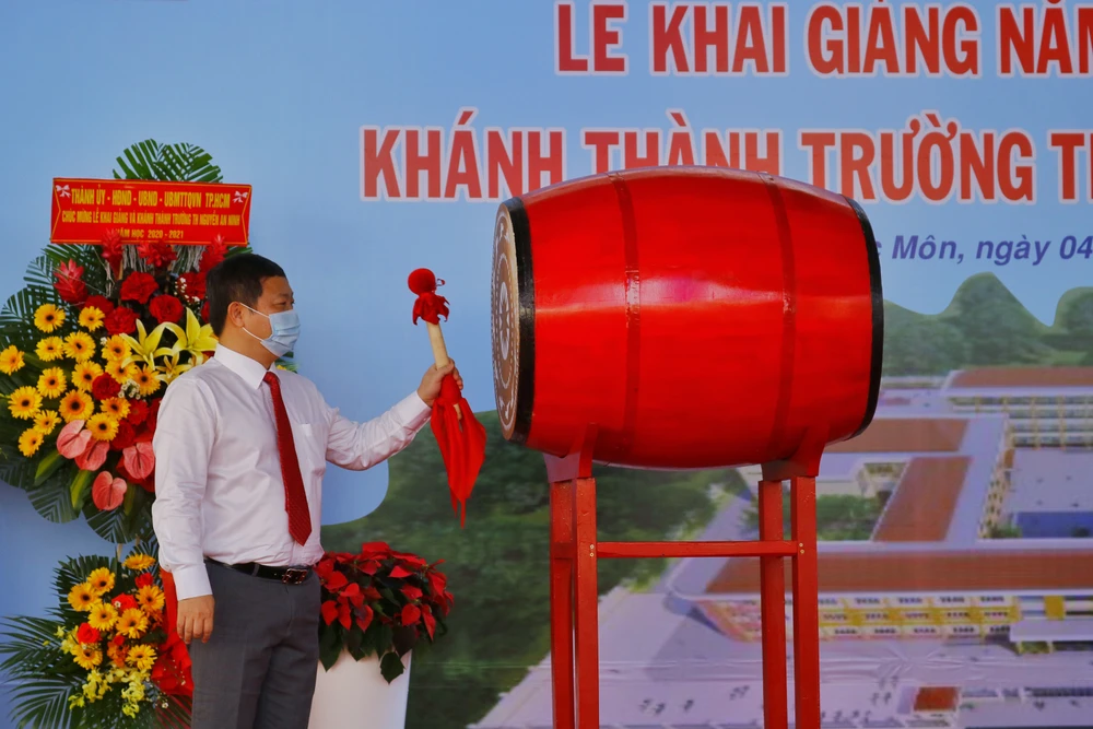 Dịp này, thầy và trò Trường Tiểu học Nguyễn An Ninh cùng dự lễ khai giảng năm học mới và chào đón các em học lớp 1. Ông Dương Anh Đức đã đánh trống khai giảng năm học mới.