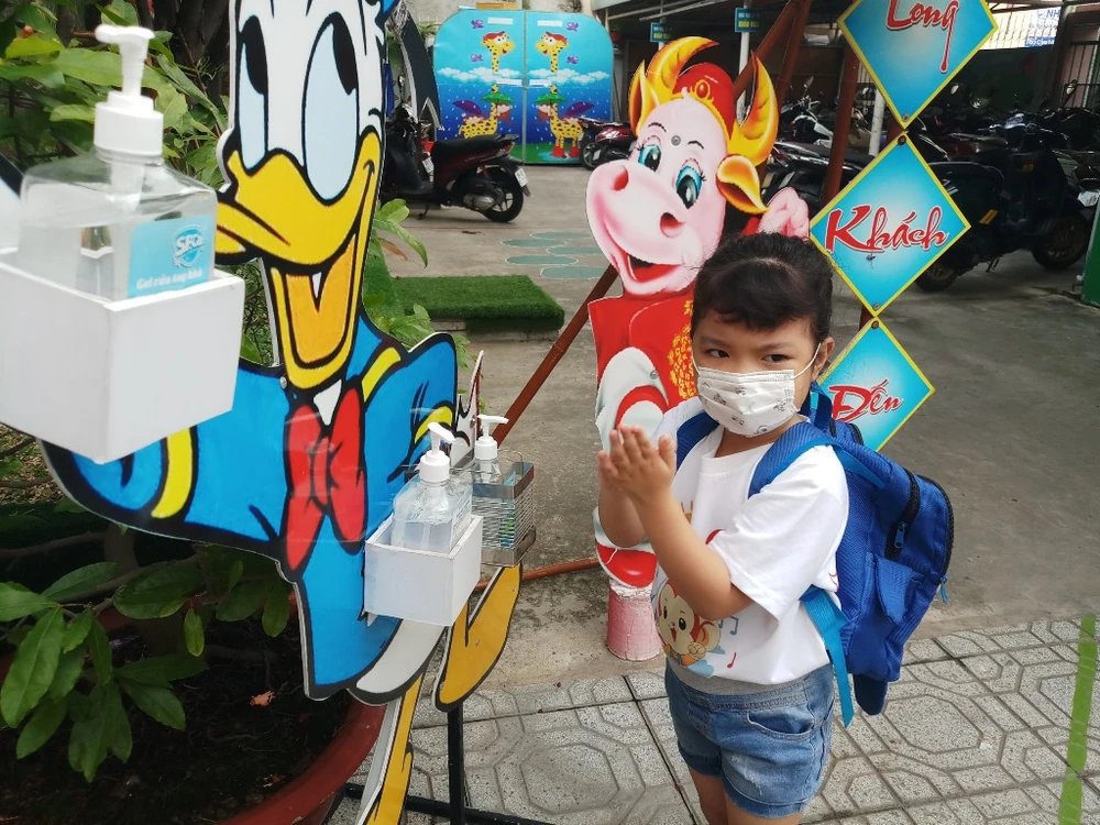 Học sinh trường Mầm non Sóc Nâu, quận Gò Vấp rửa tay trước khi vào lớp. Ảnh: NQ