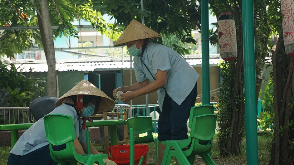 Nhân viên trường Mầm non Hạnh Thông Tây, quận Gò Vấp đang lau chùi khu vực vui chơi để chuẩn bị đón trẻ đi học trở lại từ ngày 1-3. Ảnh: NQ