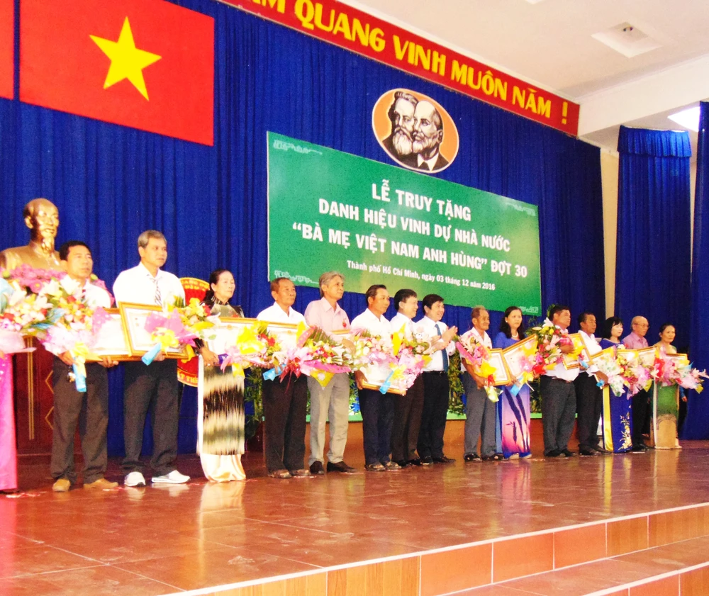 Đợt này có 107 mẹ trên địa bàn quận 12, huyện Hóc Môn và huyện Củ Chi được truy tặng danh hiệu “Bà Mẹ Việt Nam anh hùng”. Đến nay, TP.HCM có 5.127 bà mẹ Việt Nam anh hùng.