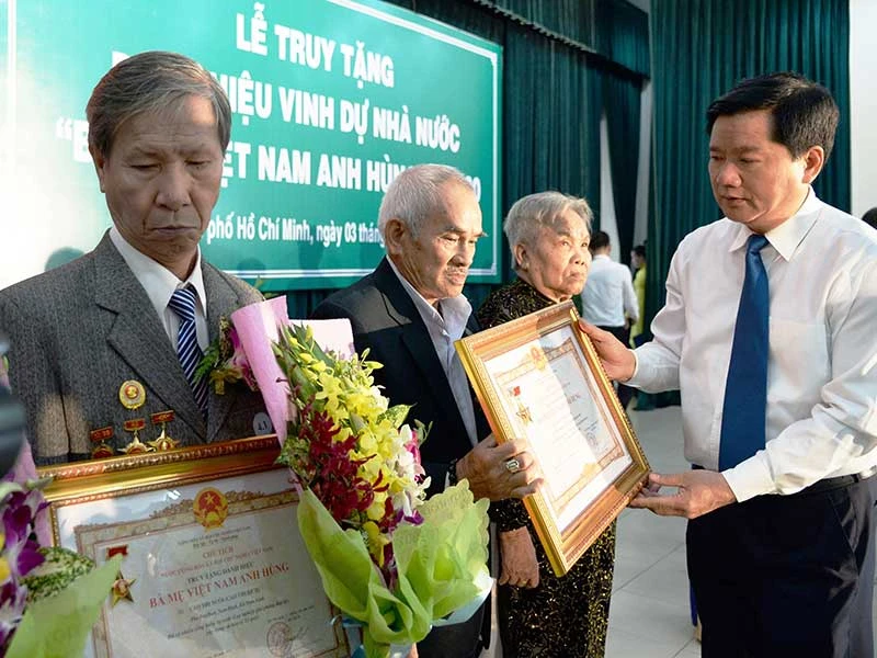 Bí thư Thành ủy TP.HCM Đinh La Thăng trao danh hiệu Bà mẹ Việt Nam anh hùng cho đại diện gia đình các mẹ. Ảnh: TÁ LÂM