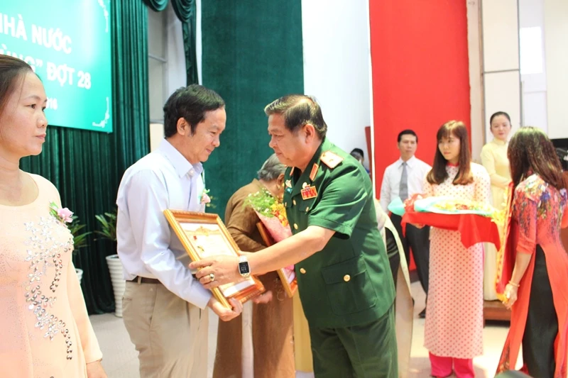 Thiếu tướng Phan Tấn Tài, Phó Tư lệnh Quân khu 7, trao tặng bằng khen cho các gia đình. Ảnh: THANH TUYỀN