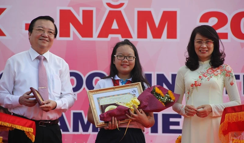 Đại diện HS tiêu biểu được Phó chủ tịch UBND TP Nguyễn Thị Thu và giám đốc Sở GD&ĐT TP tuyên dương tại buổi lễ