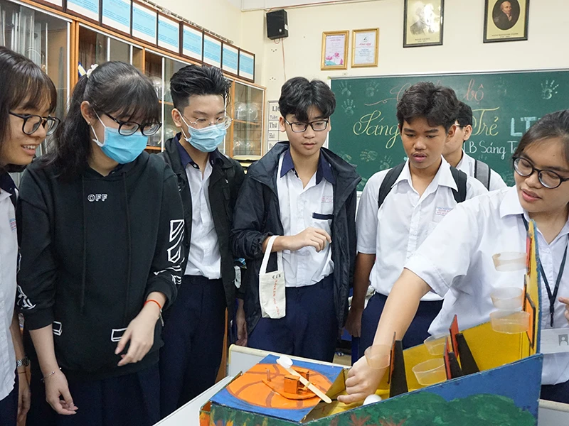 Học sinh Trường THCS Minh Đức (quận 1, TP.HCM) tìm hiểu mô hình học tập tại Trường THPT Lương Thế Vinh (quận 1, TP.HCM). Ảnh: NGUYỄN QUYÊN