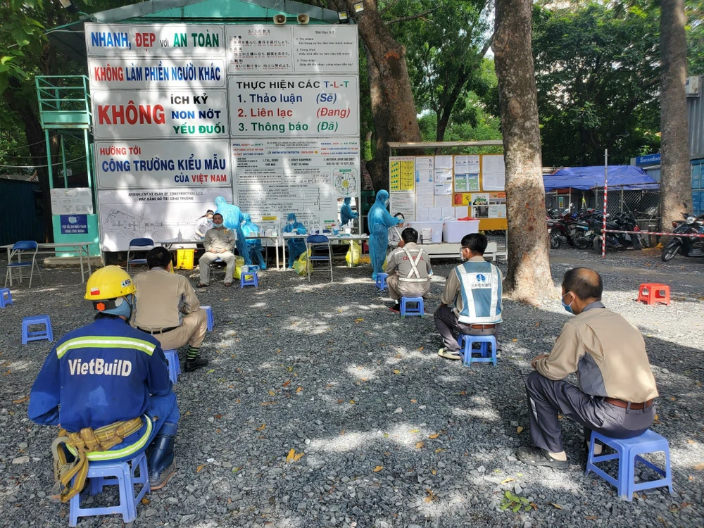 Công nhân, kỹ sư tuân thủ 5K và được lấy mẫu xét nghiệm COVID-19