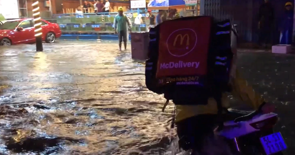 Ảnh hưởng của áp thấp gây mưa lớn ở TP.HCM. Ảnh nước ngập cả mét trên đường Nguyễn Hữu Cảnh đêm 1-6