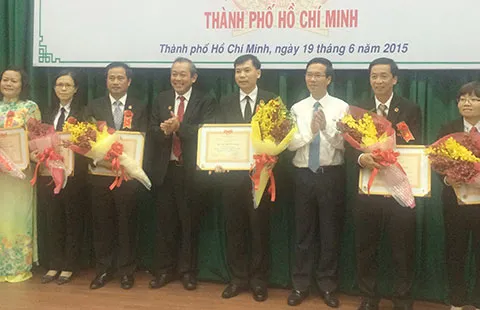Chánh án TAND Tối cao Trương Hòa Bình (thứ tư từ trái sang) và Phó Bí thư Thường trực Thành ủy TP.HCM Võ Văn Thưởng (thứ ba từ phải sang) tặng bằng khen cho các thẩm phán giỏi. Ảnh: HY