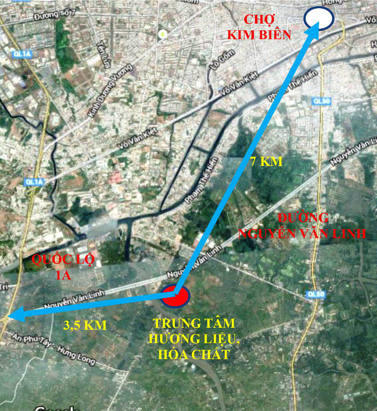 Trung tâm Kinh doanh hương liệu, hóa chất TP nằm trên trục đường Nguyễn Văn Linh, cách cảng Cát Lái 17,3 km; cách chợ Kim Biên 7 km và cách quốc lộ 1A 3,5 km. Sở Công Thương cho rằng trục giao thông từ vị trí thực hiện dự án đến cảng Cát Lái và đến quốc lộ 1A không đi qua khu vực nội thành, do đó hạn chế được các tác động xấu của sự cố hóa chất trong quá trình vận chuyển đến các khu dân cư tập trung, khu công trình công cộng, tôn giáo...