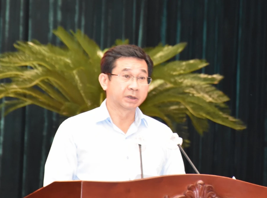 Ông Dương Ngọc Hải, Chủ nhiệm Ủy ban Kiểm tra Thành ủy TP.HCM, báo cáo tại hội nghị. Ảnh: TÁ LÂM