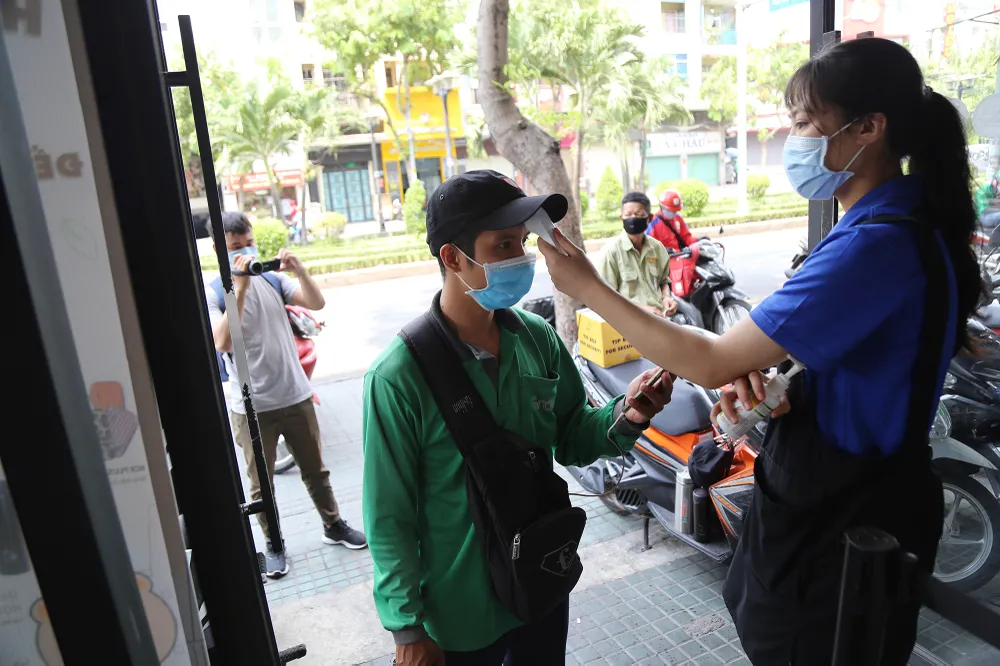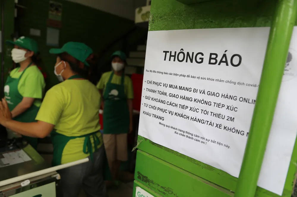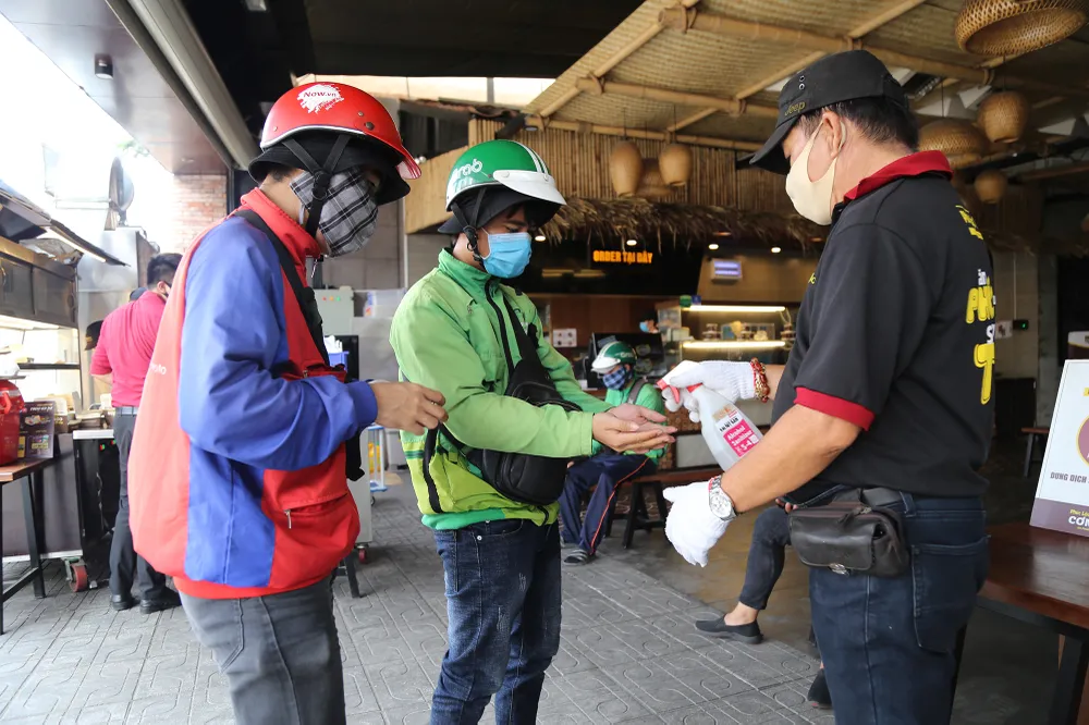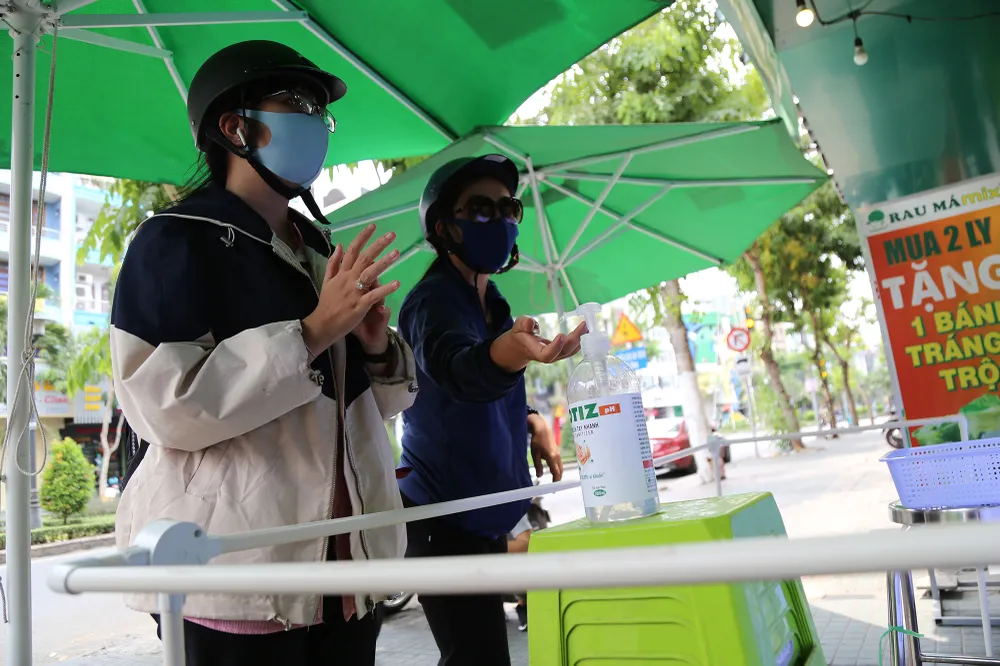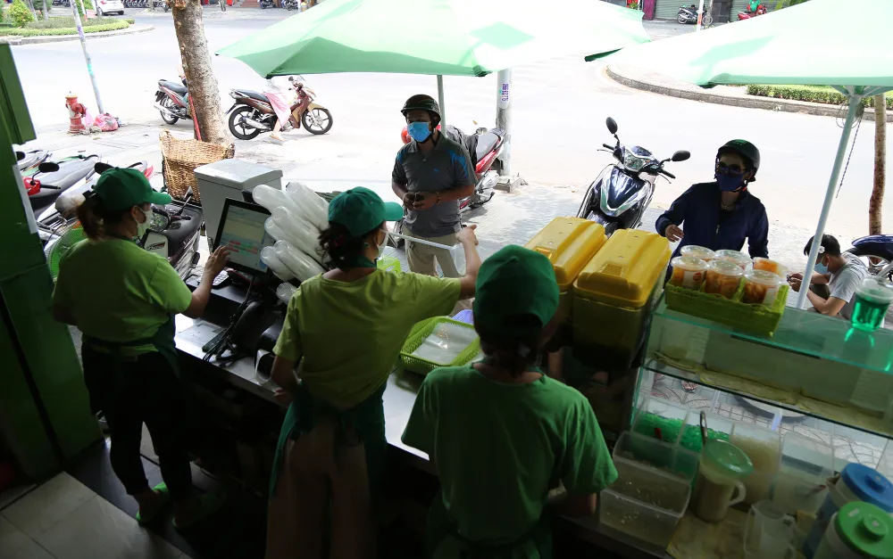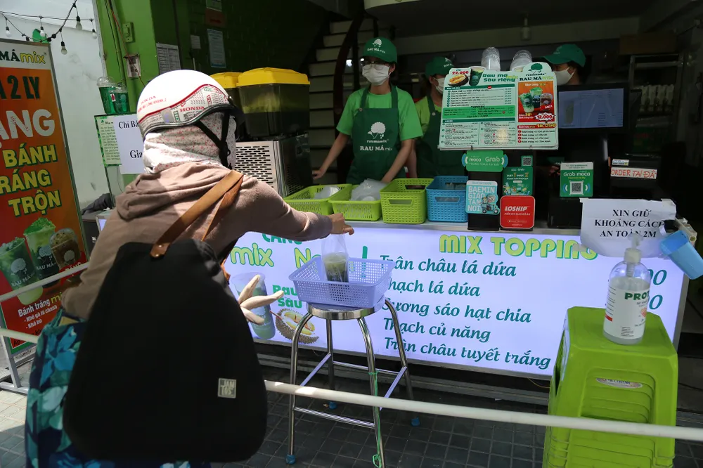 Trên đường Phan Xích Long (quận Phú Nhuận), một quán nước bố trí hàng rào dọc khu vực pha chế và thu ngân để hạn chế việc tiếp xúc với khách. Bên cạnh đó, quán dán thông báo chỉ phục vụ cho khách mang về và giao online thông qua các tài xế công nghệ.