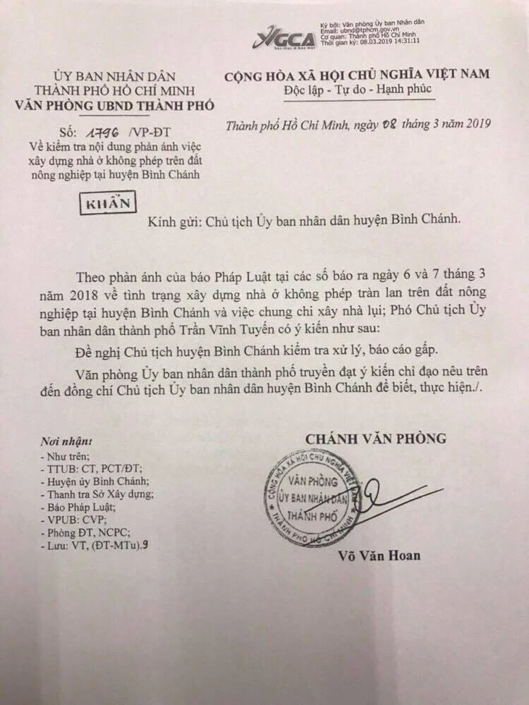 Ngày 8-3, Văn phòng UBND TP đã có văn bản khẩn truyền đạt ý kiến chỉ đạo của Phó Chủ tịch UBND TP Trần Vĩnh Tuyến về vụ việc ở Bình Chánh. Theo đó, ông Tuyến đề nghị Chủ tịch UBND huyện Bình Chánh kiểm tra, xử lý báo cáo gấp cho UBND TP. Trao đổi với Pháp Luật TP.HCM, ông Tuyến cho biết, TP cũng đang chỉ đạo Công an TP vào cuộc để điều tra, xác minh tình trạng chung chi, tiếp tay cho việc xây nhà lụi đang tràn lan ở Bình Chánh.
