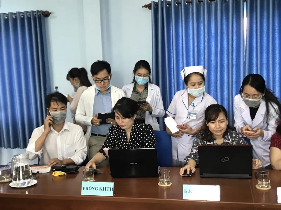 Nhân viên cơ quan Bảo hiễm Xã hội TP.HCM đang hướng dẫn, hỗ trợ các y, bác sĩ tại bệnh viện An Bình cài đặt, sử dụng ứng dụng VssID. Ảnh: CTV