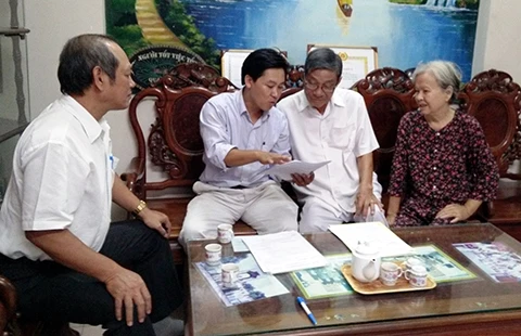 TPL Đỗ Phi Thường (Văn phòng TPL quận Gò Vấp, TP.HCM, trái) đang tống đạt giấy tờ cho người dân. Ảnh: T.TÙNG